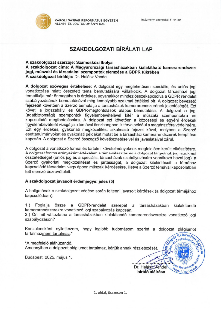 A szakdolgozatom a társasházakban alkalmazott kamerarendszerek jogi és adatvédelmi kérdéseit vizsgálja, különös tekintettel a GDPR, a magyar adatvédelmi szabályozás, valamint a gyakorlati üzemeltetés során felmerülő dilemmák összefüggéseire.